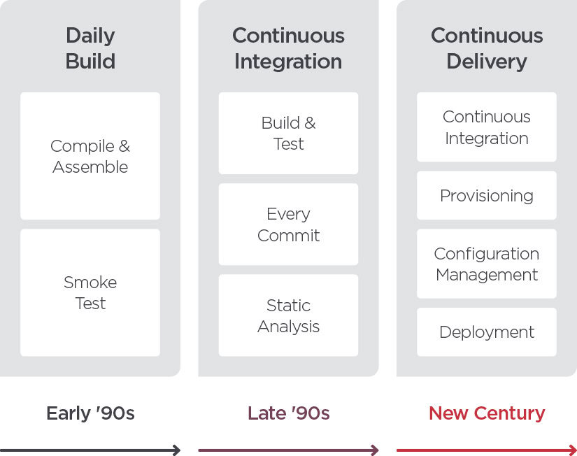 Let’s take a brief look back in time. The early nineties gave birth to a new trend—the daily build. Considering the tools and technology of the day, having an application compiled, built, tested and ready for installation every day represented a small revolution. At the end of the day, all the changes recorded in the versioning system could be processed, unit-tested and subjected to static code analysis (using tools such as CheckStyle, PMD and FindBugs). Around the turn of the century, we got used to the comforts of continuous delivery that, besides building the application itself, included preparation of all the other items necessary for delivery—configuration scripts, incremental packages, etc. All this required a mature level of automation, various tools, configuration management, definitions of procedures and processes, etc.