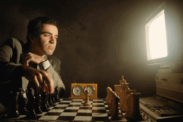 Garry Kasparov is playing a game of chess against DeepBlue, a computer by IBM.